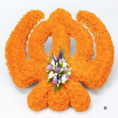 A mass of orange double spray chrysanthemums forms the Khanda tribute which is finished with a spray of white freesias, lilac lisianthus and blue veronica.